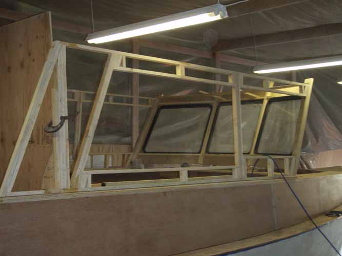 Picture with front windows installed in the frame. The back bulkhead is temporary it is there to eventually provide a template for the real bulkhead, but serves many purposes right now.