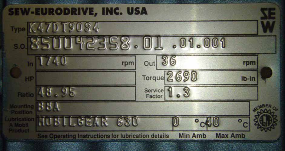 Ratio: | 48.95 | Service Factor | 1.3 | |||||